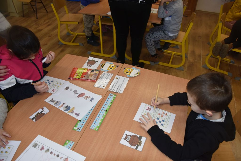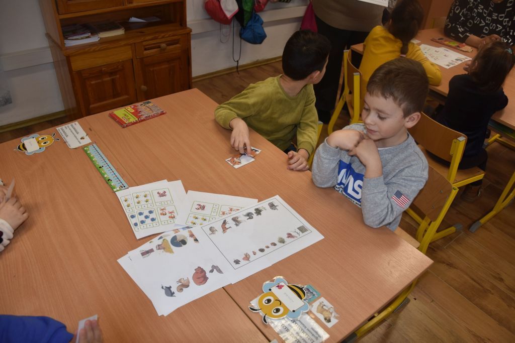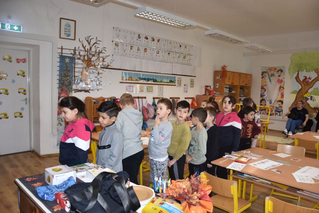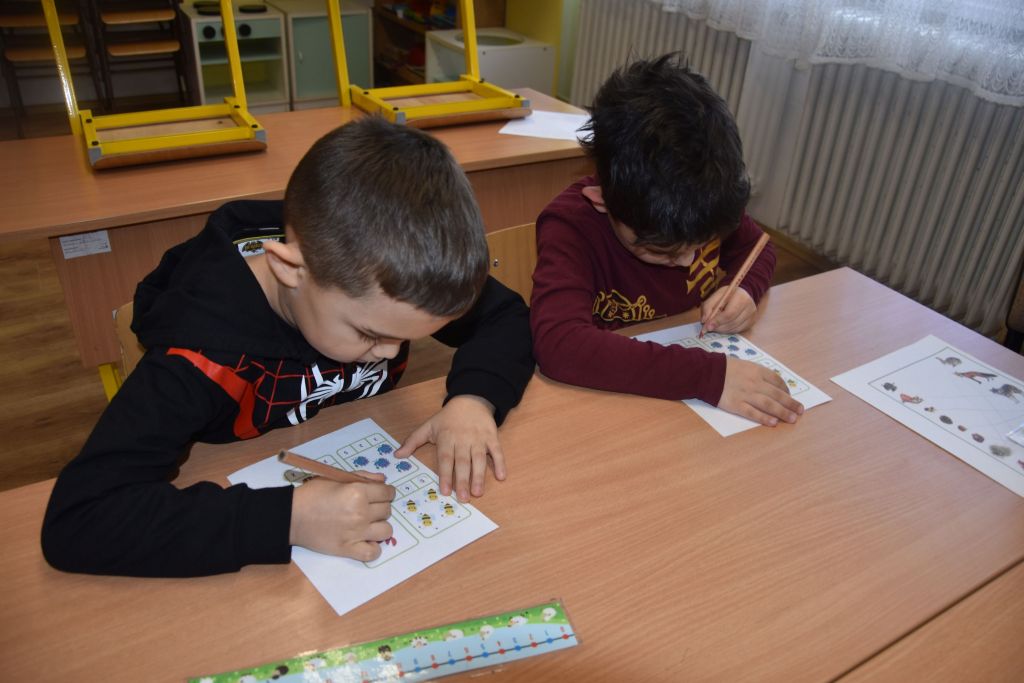 A tizenhárom nyagycsoportost Léna néni és Renáta néni kísérték át az iskola épületébe, ahol a házigazdák három, többnyire négy fős csoportra osztották őket, hogy ott több „munka”állomáson, játékosan fejlesztő, logikát, memóriát és finom-motorikát használó feladatokat kapjanak, melyeket nagy lelkesedéssel és koncentrációval végeztek el sikeresen!