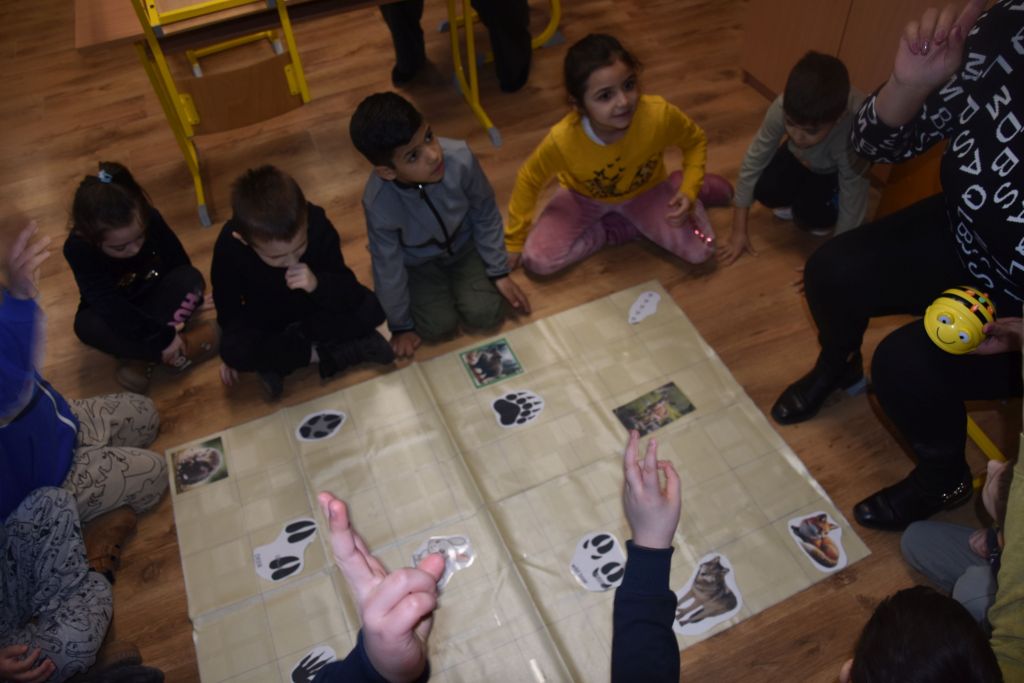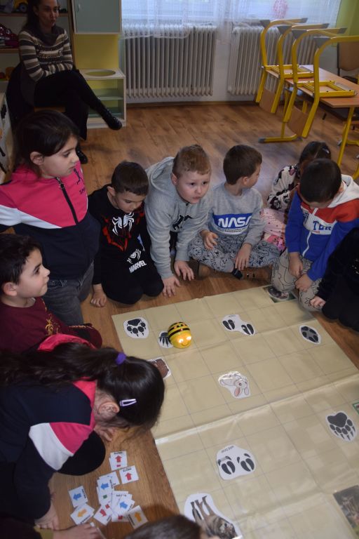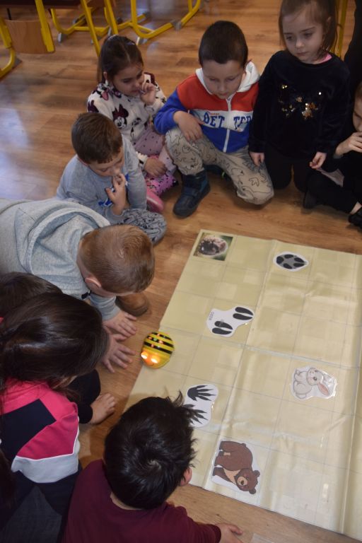A program második felében a robotméhecske segítségével párosítottuk az erdőlakókat a lábnyomaikkal. A kicsik nagy lelkesedéssel programozták a robotot.