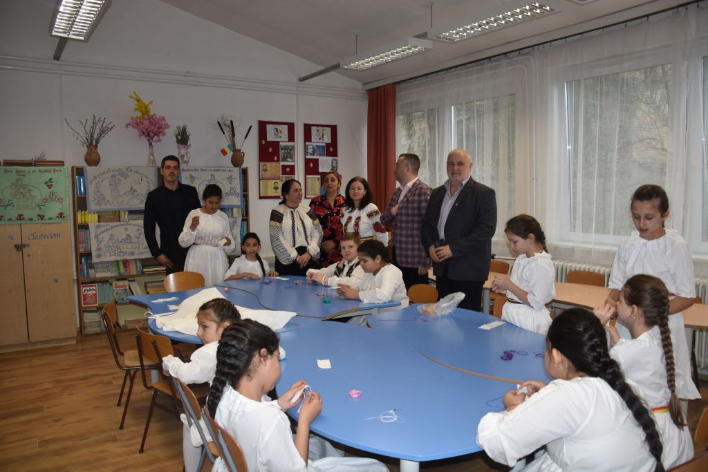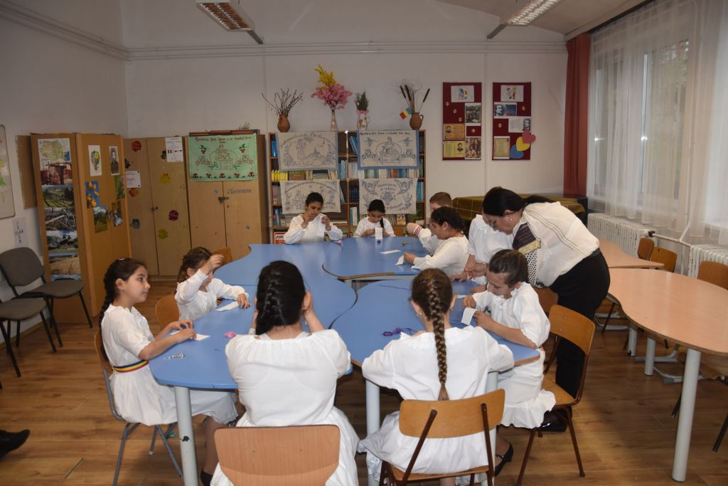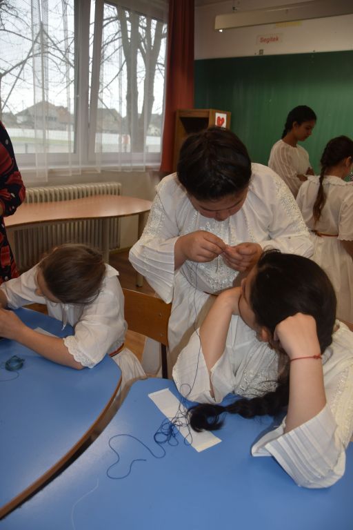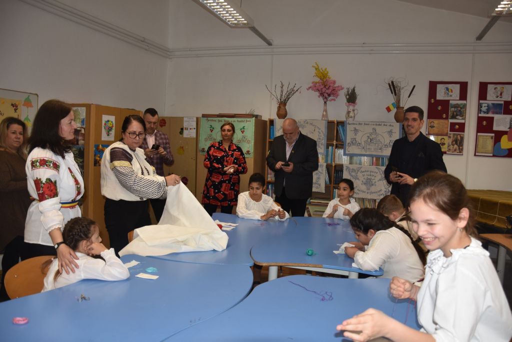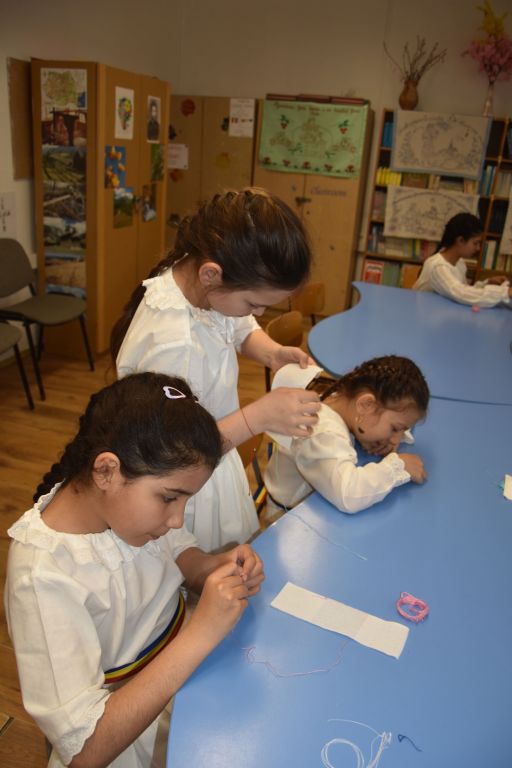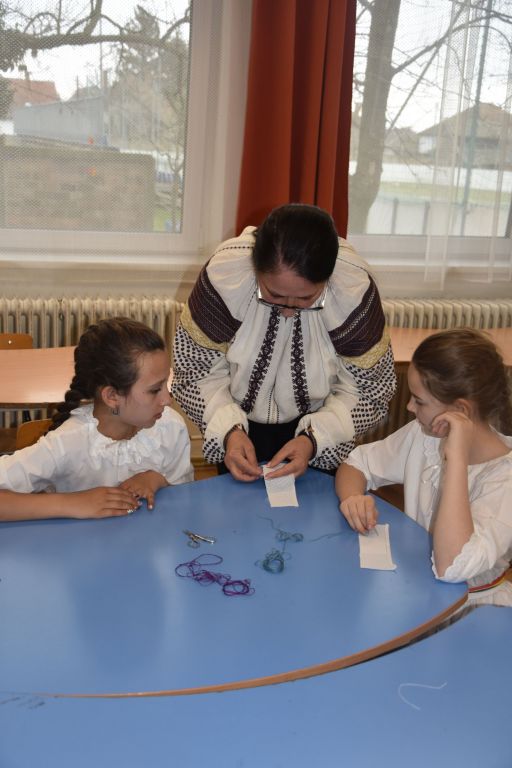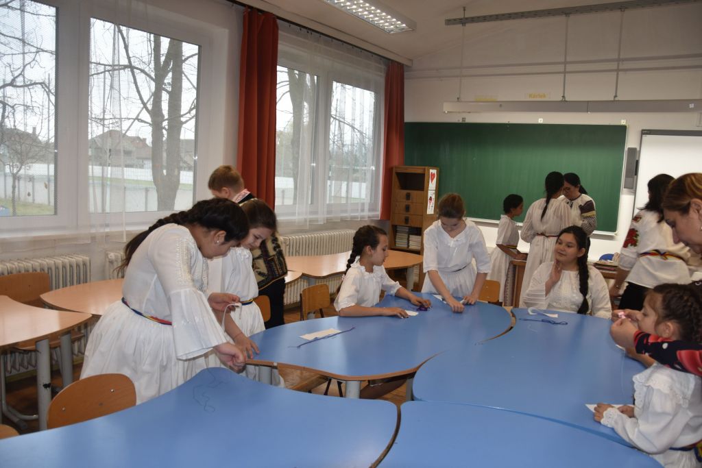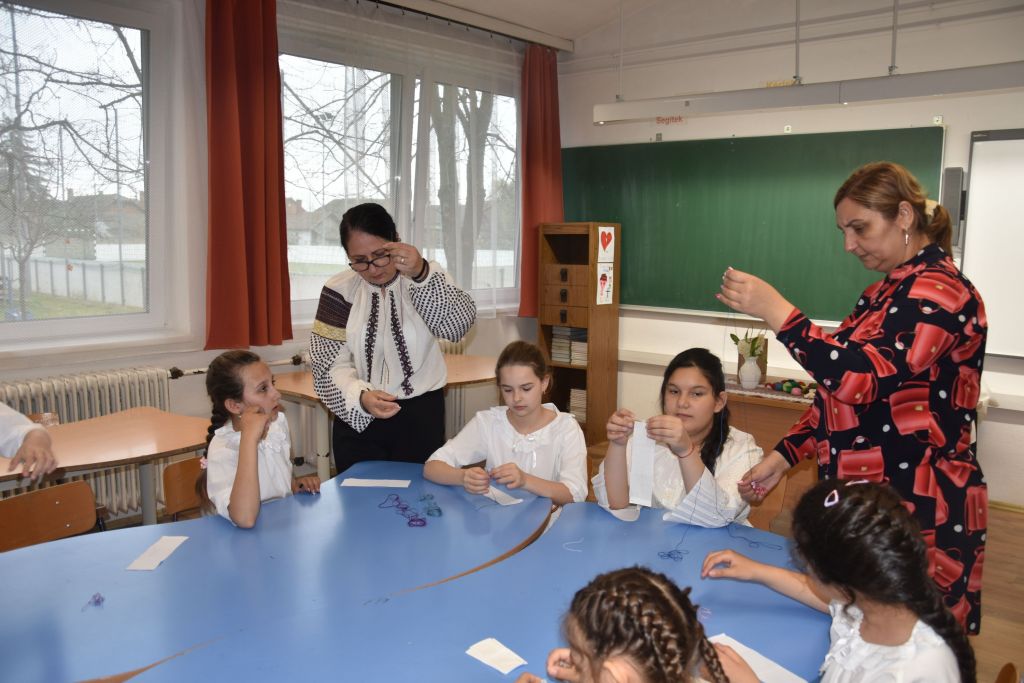 A látogatás során vendégeink betekintést nyertek iskolánk mindennapjaiba, és találkoztak a nemzetiségi programokban részt vevő tanulókkal is. Különösen nagy érdeklődés övezte Anca Becan kézműves foglalkozását, aki a román hagyományőrző szakkör tagjai számára mutatta be a román népművészet gazdag motívumvilágát. A gyerekek megismerkedhettek azokkal a jellegzetes mintákkal és szimbólumokkal, amelyek a hímzésben és varrásban jelennek meg, s amelyek generációról generációra öröklődnek.