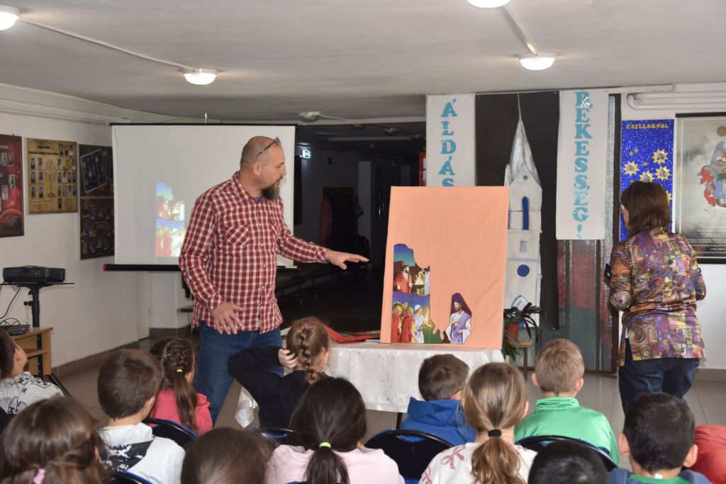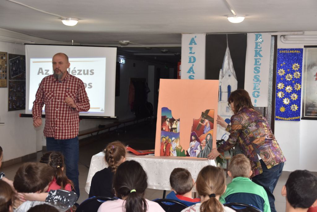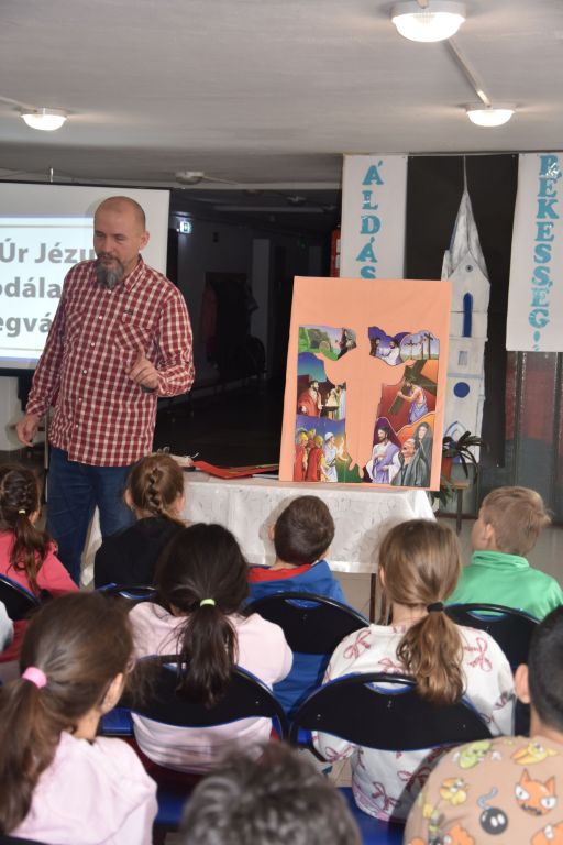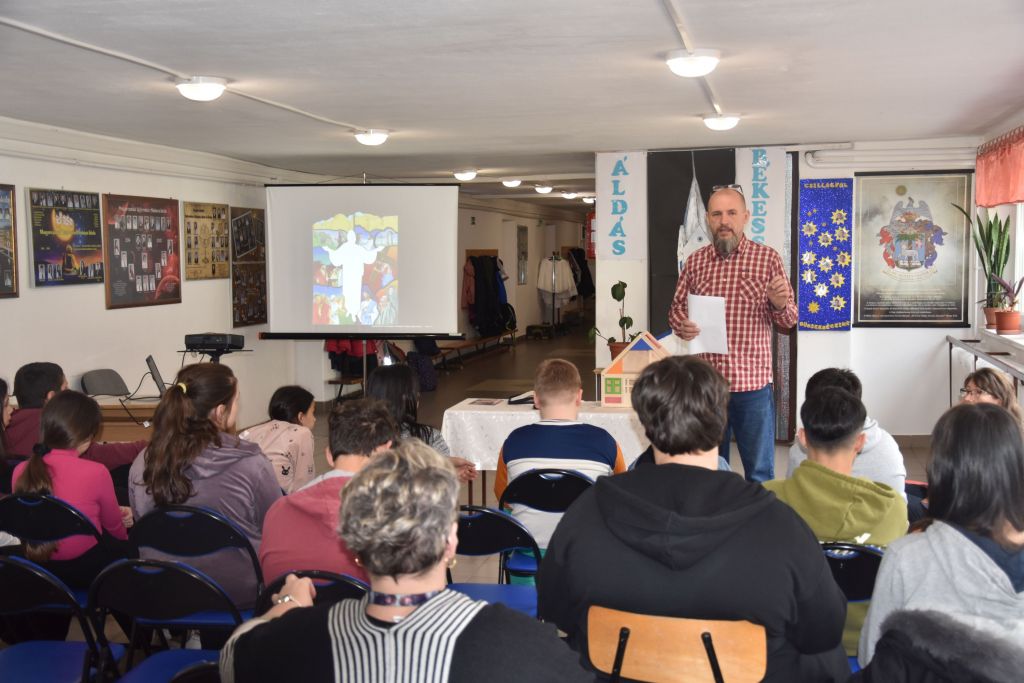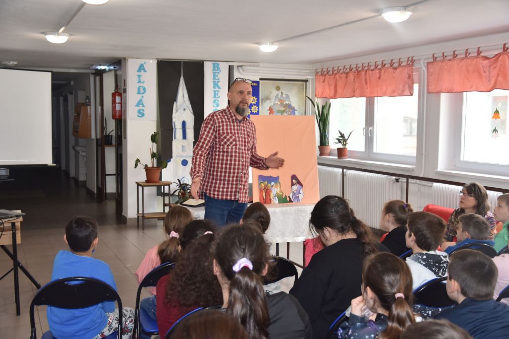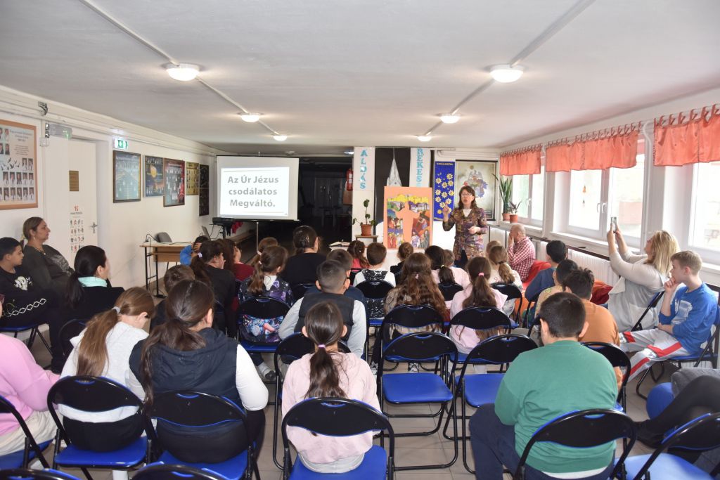 A diákok a foglalkozás aktív résztvevői voltak. Reakcióik, kérdéseik és spontán megnyilvánulásaik természetes módon épültek be az előadás folyamatába, így a történet élővé és személyessé válhatott számukra. Ez a közvetlen hangnem segítette, hogy a húsvéti üzenet – a remény, a megújulás és az újrakezdés gondolata – életkorukhoz közel álló módon szólaljon meg.