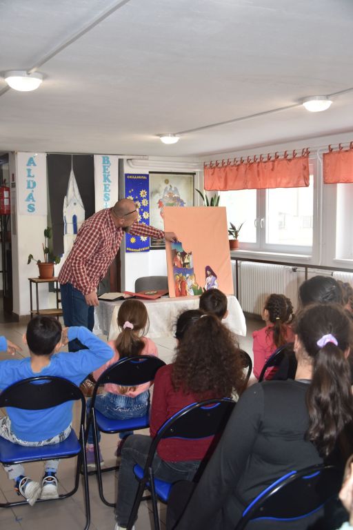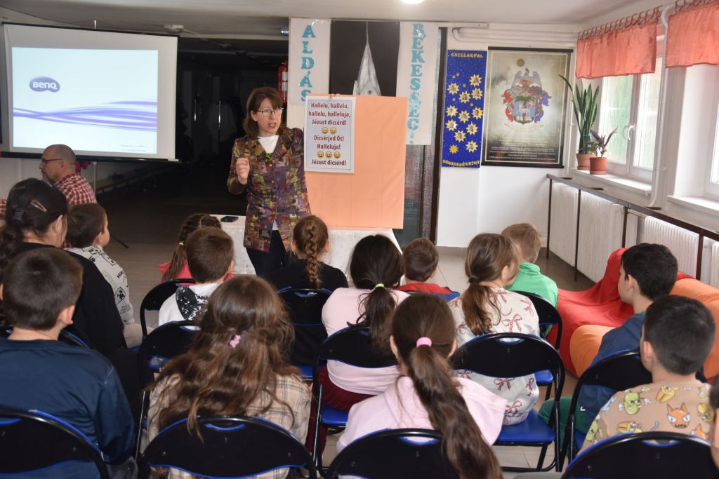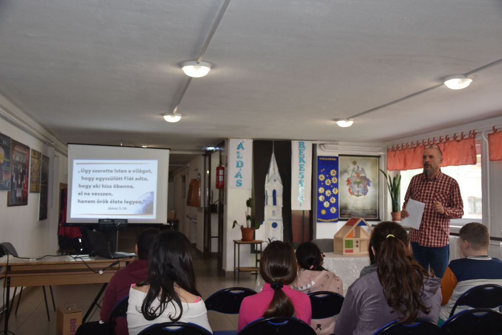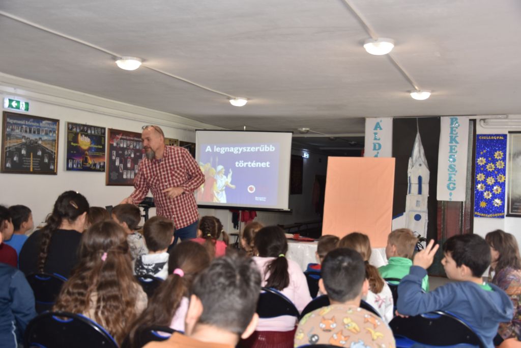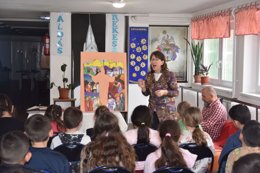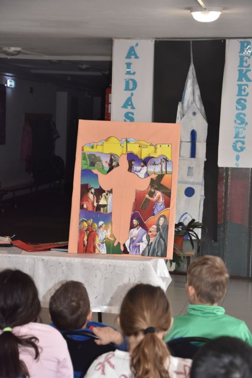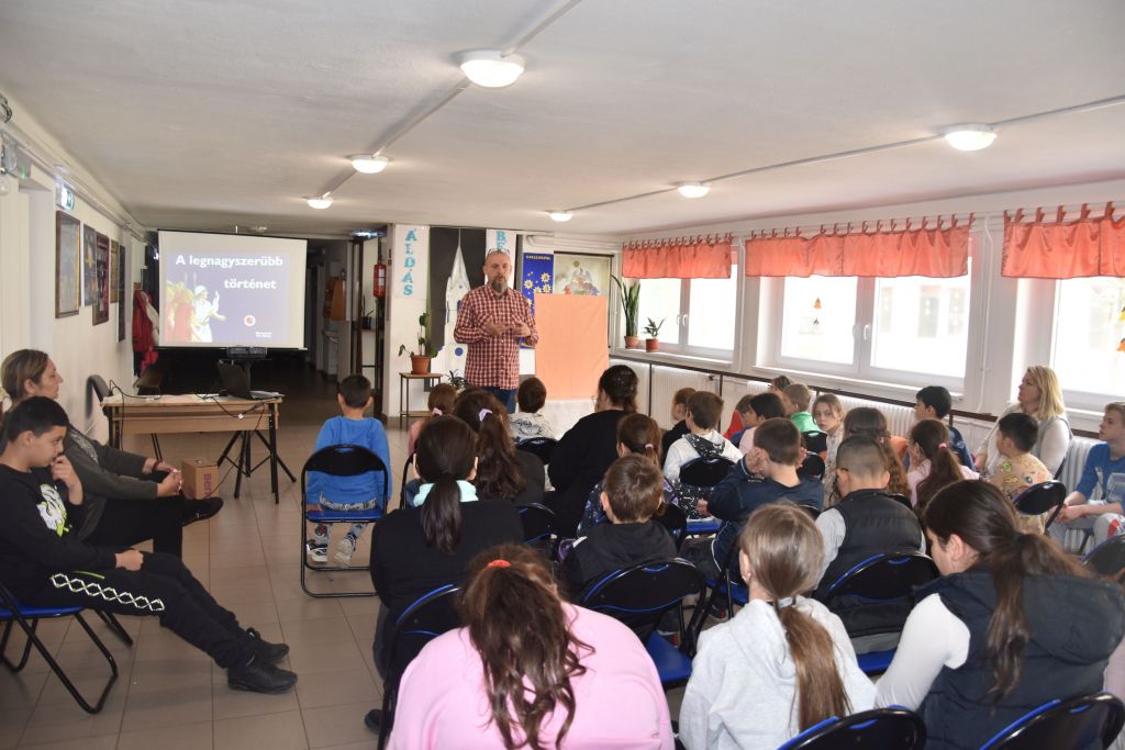 A diákok a foglalkozás aktív résztvevői voltak. Reakcióik, kérdéseik és spontán megnyilvánulásaik természetes módon épültek be az előadás folyamatába, így a történet élővé és személyessé válhatott számukra. Ez a közvetlen hangnem segítette, hogy a húsvéti üzenet – a remény, a megújulás és az újrakezdés gondolata – életkorukhoz közel álló módon szólaljon meg.